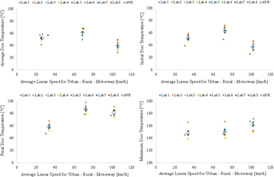 Table 5 shows that the repeatability standard deviation is less than 1% of the mean values for braking speed and deceleration, as well as for the maximum brake temperature (regardless of the measurement method) and the cooling air temperature. In general, it seems that the repeatability within the labs for most parameters is within reasonable ranges both for the whole cycle, as well as for individual trips. Regarding the variation between samples as expressed by , it follows the trends described for the repeatability standard deviation. Table 5 shows that only the maximum temperature measured with TCRub exhibited relatively high variation (between 15% and 25% of the mean value) between labs, while all other parameters showed no significant difference between T1 and T2 (below 0.5% of the mean value for control parameters: Braking speed, braking deceleration, and braking torque). When studying the standard deviation for the between laboratory effect it seems that most parameters come with relatively high values. More specifically, deceleration and maximum brake temperature standard deviations are frequently higher than 15%. In contrast, the standard deviation of cooling air parameters depends on whether the examination includes all labs or only the ones with conditioned air for temperature and humidity. Finally, the standard deviation for reproducibility seems to be at an acceptable level. It is again the maximum temperature that comes with relatively high values, regardless of the measurement method, while deceleration seems to be less reproducible compared to the rest of the examined parameters.