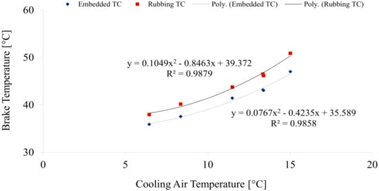 The following analysis uses data from Lab 4 to study the influence of the incoming cooling air temperature on the brake temperature profile. Another advantage of using data from only one lab is to keep the rest of the testing parameters constant during all repeats. This approach allows the assignment of observed differences in the brake temperature primarily to the conditions for the incoming cooling air temperature. Figure 6 depicts the average disc temperature recorded in each one of the six repetitions of T1. The results include both TCEmb (blue marks) and TCRub (red marks), while polynomial fits are indicative and do not correspond to any model for convective heat transfer.