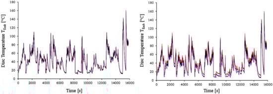 The difference is also apparent when examining the 1 Hz data for the disc temperature. Table 6 shows that R2 and R3 of Lab 4 exhibited a performance comparable for cooling air temperature and RH, resulting in identical average disc temperatures. Figure 7 (left-hand side) depicts this well, illustrating the disc temperature profile of the two repetitions throughout the entire cycle. The two repetitions resulted in identical disc temperature profiles over the whole duration of the cycle. On the other hand, Figure 7 (right-hand side) illustrates the differences between R2 (red line) and R5 (purple line), especially for temperatures below 60 °C. In this case, R2 was conducted with an average cooling air temperature of 13.4 °C, resulting in generally higher disc temperatures. In comparison, R5 was performed with an average cooling air temperature of 8.4 °C and resulted in significantly lower disc temperatures. Moreover, it is imperative to take into account the fact that R5 ran with 20% higher RH than R2.