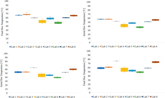 A remarkable find is that the application of different initial disc temperature at the beginning of the cycle does not seem to influence the maximum disc temperature over the cycle. Figure 10 shows that most of the tests were performed with an initial disc temperature of approximately 20–25 °C and resulted in maximum disc temperature in a wide range of 150–190 °C. Moreover, Lab 4 that performed tests with entirely different initial disc temperature resulted in maximum disc temperature of approximately 160 °C, regardless of the initial cycle temperature. It seems that other parameters are affecting maximum temperature rather than the temperature at the beginning of the cycle, and thus, the correct application of soak times.