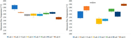 Examination of mean values of the averaged maximum disc temperature confirms the previous statement; temperature measurements employing TCEmb are more robust and repeatable compared to TCRub. The bottom panels in Figure 8 clearly illustrate that the mean maximum temperature values measured with the TCEmb are very close to each other for most of the labs and lie within a 30 °C range. On the other hand, the average values for the maximum temperature values measured with the TCRub deviate significantly among the labs and lie between 55 °C and 60 °C (i.e., Maximum Temperature between Lab 3 and Lab 4). The assessment above concludes that temperature measurement and subsequent analysis shall use only TCEmb. The same tests with TCRub can result in twice as high deviations.