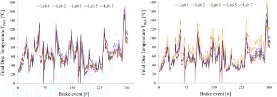 Figure 9 depicts the disc final temperature profile for all 303 brake events of the R1–T1 using TCEmb (left-hand side) and TCRub (right-hand side), respectively. Both figures include only the labs that were able to control the temperature and humidity of the incoming cooling air as requested. Temperature measurement with TCEmb is more robust and exhibits a lower deviation among the labs, remaining mostly below 20 °C for all braking events. In comparison, TCRub provides readings with deviations between labs of up to 50 °C, especially for high energy braking events close to the end of the WLTP–Brake cycle.