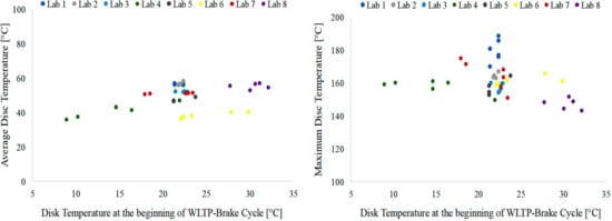 Average (left-hand side) and maximum (right-hand side) disc temperature over the WLTP–brake cycle plotted against the disc temperature at the beginning of the cycle.
