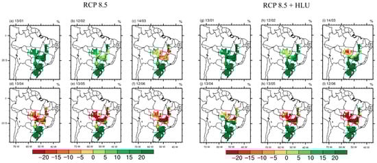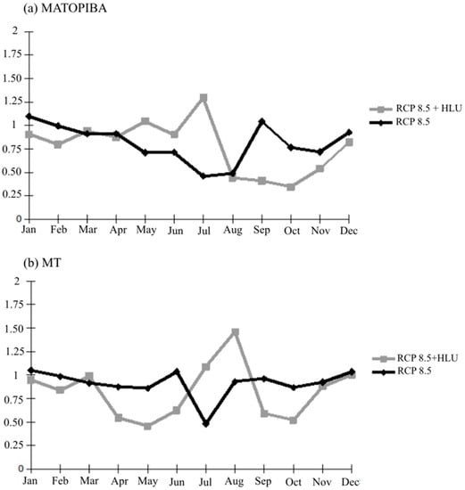 Precipitation change between 2041–2050 and 2011–2020 for each study region: (a) The region formed by the Brazilian states of Maranhão, Tocantins, Piauí, and Bahia (MATOPIBA) and (b) Mato Grosso state (MT) for both scenarios. In RCP 8.5 + HLU, deforestation levels of Amazonia and Cerrado biomes are: 20% and 60% in first decade and 40% and 70% in last decade, respectively. In RCP 8.5, deforestation levels of Amazonia and Cerrado biomes are 20% and 60% in the first decade, and deforestation levels of both biomes in the last decade remain almost the same, as demonstrated by Pires et al. [4].