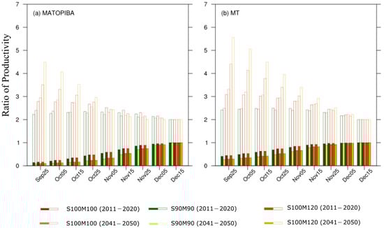 Yield ratio for each sowing date according to yield of 15 December for each decade and cultivar combination for soy–maize double cropping according to RCP 8.5 scenario in (a) MATOPIBA and (b) MT region. The filled and blanked bars represent soybean and maize yield ratio, respectively, for each cultivar combination and period.
