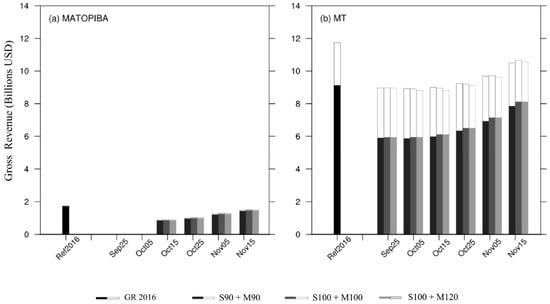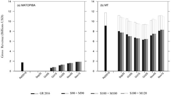 The gross revenue (GR) was evaluated according to the sowing and harvesting windows of each region. In Brazil, soybean sowing operation can only begin after the end of the sanitary break. In MT, the sanitary break currently lasts from 15 June to 15 September [38], while in MATOPIBA it lasts from is 1 July to 15 October within the study area [39,40,41,42]. Considering these restrictions, we evaluated the gross revenue from 25 September and from 25 October for MT and MATOPIBA, respectively.
