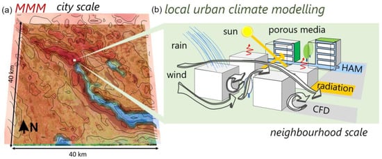 The prediction of the local urban climate at the scale of neighbourhood or street canyon is complex as a series of physical processes need to be modelled at sufficiently high temporal and spatial resolutions, such as local wind dynamics due to different building forms [], urban ventilation within and above complex three-dimensional street canyons [], heat and moisture transport at porous surfaces of building façades [], evapotranspiration by vegetation in streets [], wind-driven rain and runoff [], solar radiation entrapment and local shading [], local anthropogenic heat [], etc. A rational approach to model local urban climate is to couple mesoscale meteorological models (MMM) such as COSMO (Consortium for Small-scale Modelling) and WRF (Advanced Weather and Research Model) to building-resolved computational fluid dynamics (CFD), heat-air-moisture (HAM) transport model and building energy simulation (BES), as shown in Figure 1. Such coupling of models provides an affordable level of computational cost while preserving the necessary resolution at the respective scales: from meteorological data at mesoscale (domain size < 200 km) to heat and moisture transport at city scale (domain size < 15 km), neighbourhood scale (domain size < 2 km), local scale (domain size < 100 m) and down to material scale.