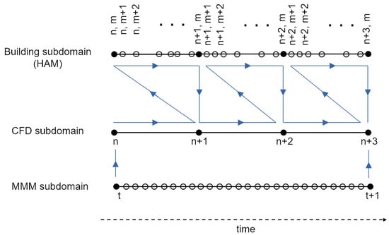 Temporal coupling between subdomains. Figure adapted from Kubilay et al. [] with permission. (n: exchange timesteps between CFD and HAM, m: adaptive timesteps for the unsteady HAM, t: output timesteps for MMM).
