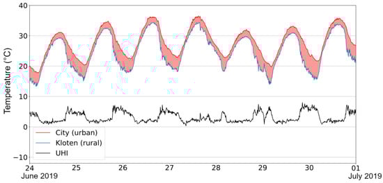 Measured air temperature at 2 m height during the heat wave between 24 June and 1 July 2019 in Zurich and the associated urban heat island (UHI) intensity based on urban and rural temperatures. Datasource: MeteoSwiss (Kloten) and Swiss National Air Pollution Monitoring Network (NABEL).