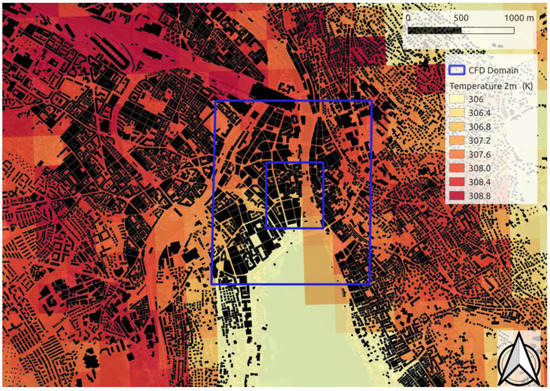 Martilli et al. [] present a building effect parametrisation model (BEP) based on the single urban canopy parametrisation allowing building height variation and different canyon orientations originally implemented in WRF. Wouters et al. [] present a bulk urban canyon parametrisation TERRA-URB for COSMO. Trusilova et al. [] create a single layer urban canyon model for COSMO, COSMO-TEB, with one generic canyon morphology for the whole city. Schubert et al. [] propose the double-canyon effect parametrisation (DCEP) model for multi-layer urban canopy representation, taking into account the radiation exchange for two neighbouring canyons treating direct and diffuse radiation separately. Mussetti et al. [] show that using sub-kilometre resolution (250 m resolution) enhances the model performance to capture urban effects. BEP-Tree, presented by Krayenhoff et al. [], models street trees and their effects as possible heat mitigation method. BEP-Tree and COSMO are used by Mussetti et al. [] to study the effect of trees and the UHI in cities. Even with such parametrisation, MMMs present limitations, mainly due to low resolution and the lack of resolved local velocity fields around buildings [], pointing to an approach, where MMMs are coupled with building resolved CFD simulations particularly for analyses at local scale.