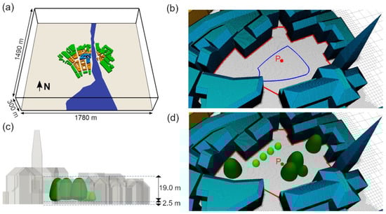 (a) Computational domain. (b) Grid on the surfaces of Münsterhof, an urban square in Zurich, in reference configuration. (c,d) Configuration with trees added within Münsterhof.