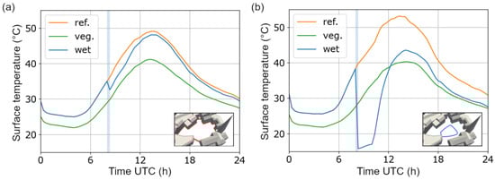 Variations of temperature of the ground surface of Münsterhof averaged over (a) the complete square area and (b) the wetted pavement area (where the light blue band indicates the duration of wetting), for the reference case (ref.), the case with artificial wetting (wet) and the case with trees (veg.) on 25 June 2019.