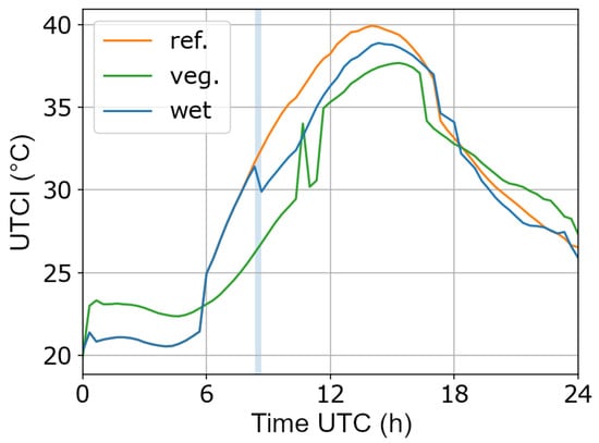 The reduction in surface temperature in the cases with artificial wetting and vegetation results in a local decrease in the air temperature, improving thermal comfort. However, at the same time, evaporation in both cases leads to higher relative humidity locally. The presence of trees, with their porous foliage, is also found to decrease wind speed, hence reducing ventilation. Reduced wind speed and increased relative humidity have an adverse impact on thermal comfort. The resulting pedestrian thermal comfort is evaluated using the Universal Thermal Climate Index (UTCI) [], which is an equivalent temperature perceived by a pedestrian based on local values for air temperature, relative humidity, wind speed and mean radiant temperature. Figure 8 shows the obtained UTCI values for the 1.7 m-high position indicated with P in Figure 6, showing a peak heat stress around 14:00 UTC for the reference case. After artificial wetting, the UTCI values decrease by up to 3.2 °C, i.e., thermal comfort improves, but later in the afternoon this difference decreases. In the case with trees, during daytime, there is a significant improvement in thermal comfort and UTCI values decrease by up to 6.9 °C, while the UTCI values are higher than the reference case during night time as a result of the reduced sky view factor.