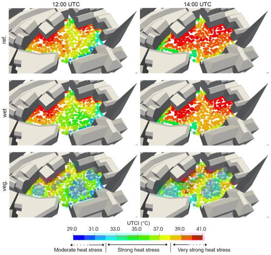 Spatial variation of thermal comfort index UTCI at pedestrian height in Münsterhof for the reference case (ref.), the case with artificial wetting (wet) and the case with trees (veg.) at 12:00 and 14:00 UTC on 25 June 2019.