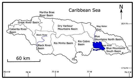 The main river basins in Jamaica. The Kingston Basin is highlighted blue. Adapted from [].