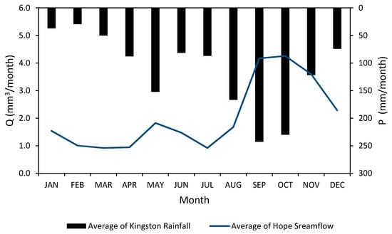 Average monthly rainfall (P; right-hand y-axis) and streamflow (Q) variation in Hope Demand Zone (1999–2018).