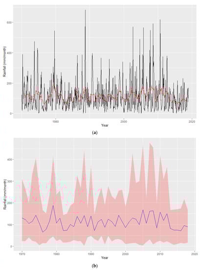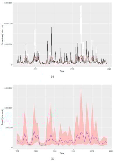 (a) Monthly rainfall (black line) and three-year moving average (red line); (b) Variability of annual rainfall for the period 1970–2018, showing the mean (blue line) and 5th to 95th percentiles (red band); (c) Monthly runoff (black line) and three-year moving average (red line); (d) Variability of annual streamflow for the period 1970–2018, showing the mean (blue line) and 5th to 95th percentiles (red band).
