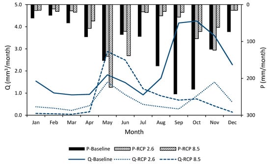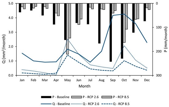 Projected changes by 2030 in rainfall (P; right-hand y-axis) and streamflow (Q) under RCPs 2.6 and 8.5.