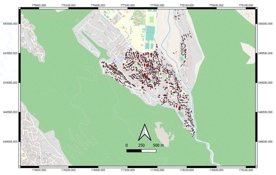 RWH is premised on the potential capacity of rooftops (Figure 7 and Figure 8) in the urban area to collect rainfall to augment existing water supply based on average monthly historical rainfall patterns. In both the Mona and August Town Communities, the rooftop types observed were typically galvanized sheets, and as such the rooftop coefficient used was 0.90 (Table 1). An uptake fraction (defined as the proportion of households in principle willing to implement RWH in the absence of barriers) was determined based on the household surveys as an average of 85% willingness to adopt RWH. The total rooftop area for Mona was 234,426 m2 and August Town was 134,640 m2. In both communities, the majority of the buildings were houses, however infant schools and churches were also identified. With respect to building distribution, it was observed that the Mona Community was denser compared to the August Town Community that also contains squatter settlements.