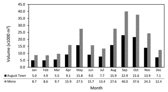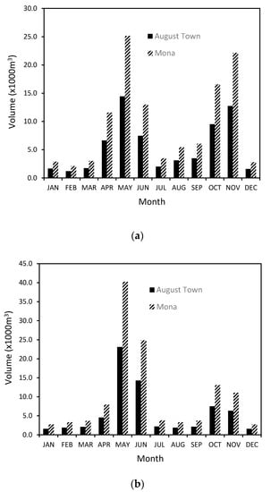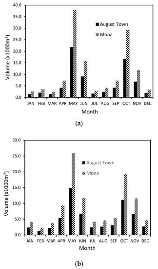 To assess required household storage requirements to fully utilise captured RWH for non-potable demand, the historical rainfall and water demand patterns were derived for the two surveyed communities using baseline data. It is assumed that the total potential RWH volumes estimated are captured, which is rarely the case. In reality, space, cost, treatment, personal motivation, institutional/governance policies, and knowledge tend to prohibit potential volumes being realised []. An estimate of storage requirements was done using the mass curve technique [,]. In this method, the cumulative rainfall runoff and cumulative household water demand in Mona and August Town for the baseline period were calculated. Thereafter, the sum of the maximum difference observed between the rainfall (i.e., supply) curve and water demand curve was used to determine the capacity of water storage required to meet this maximum difference []. According to the 2011 Population Census conducted in Jamaica, the total number of households in August Town and Mona communities were 1902 and 1891 respectively with an average number of three persons per household [].