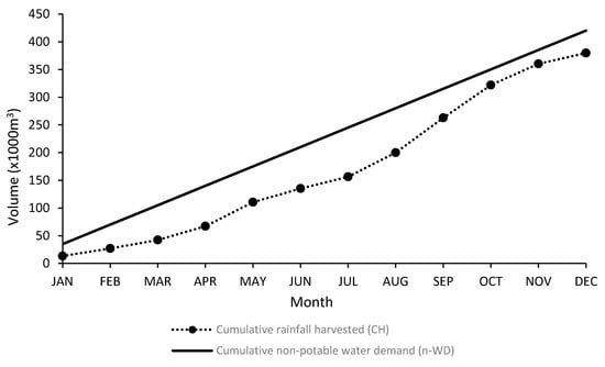 When non-potable demand is considered [], estimated that in a typical household in Kingston and St. Andrew, 40% of total water use was allocated to toilet flushing which is one of the main non-potable uses of potable water supplied to the Kingston Basin. As shown in Figure 12, the cumulative non-potable household demand (solid line) is consistently higher than the RWH that can be harvested each month (dashed line; i.e., demand exceeds possible supply). This cumulative difference divided by the number of households (i.e., 3793) gives the storage necessary to meet non-potable water demand. Assuming 40% allocation to non-potable demand, the maximum difference between non-potable demand and harvested rainwater, and thus monthly rainwater storage required was determined to be 88,687 m3 (in July) from both communities (Figure 12) which represents about 1 m3 per household to satisfy daily non-potable water demand in this dry month in these two communities.