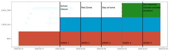 In this study, the impact of COVID-19 containment measures on Lombardy’s air quality is quantified by comparing two simulations, which consider the emission reductions during the lockdown, with a reference BAU scenario. To highlight the importance of traffic reduction on NO2 concentration variations, the LOCK_TRA scenario assumes that only transport-related emissions are reduced, while the more realistic LOCK_ALL scenario also accounts for the decline in industrial activities. The application of increasingly rigorous and containment measures in Lombardy was made weekly, and for that reason, the two scenarios are designed by rescaling BAU emissions with weekly emission reduction factors. Figure 2 shows the timeline with the main government decrees and the setup of the three simulations. The case study is focused on a five-week period, from 24 February to the end of March, and LOCK_TRA and LOCK_ALL are the same until 23 March, when only factories attributable to essential supply chains were authorized to remain operative. The period before 24 February can be considered as a spin-up. More implementation details are provided in Section 2.3.