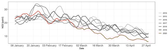 The 7-day moving average of NO2 atmospheric hourly concentration measured at ARPA Lombardia sites, from 1 January to 30 April for the years 2014–2020.