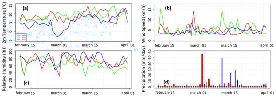 Trends of air temperature in Celsius degrees (a), wind intensity in Km/h (b), relative humidity in percentage (c), and total daily precipitation in mm (d), registered in Milan in the period 10 February–31 March for the years 2018 (blue lines), 2019 (green lines), and 2020 (red lines).