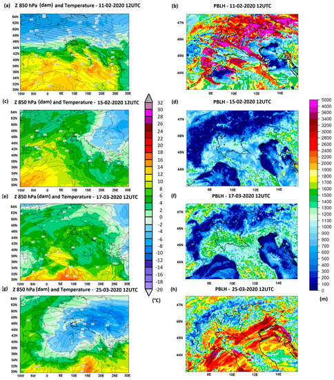 A more detailed description of the meteorological conditions which occurred during the lockdown is reported. In Figure 5, the maps of the geopotential height Z (dam) and temperature at the 850 hPa level (a,c,e,g) in correspondence with the more interesting weather situations are also presented. To give an idea of the effect of the general circulation in the lower atmosphere, the corresponding planetary boundary layer (PBL) height is also reported alongside.