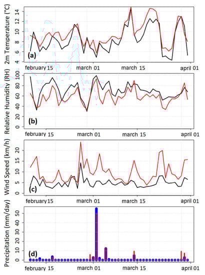The 2m temperature (°C) (a), relative humidity (%) (b), wind speed (km/h) (c), and cumulative daily precipitation (mm) (d) in the city of Milan for the period 10 February–31 March 2020. Simulated variables with the WRF model are represented by red, and the observations are represented by black and blue (for precipitation).