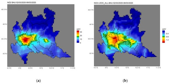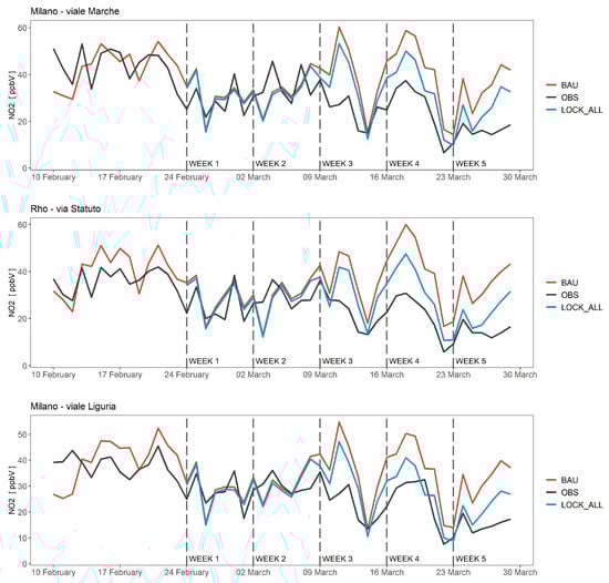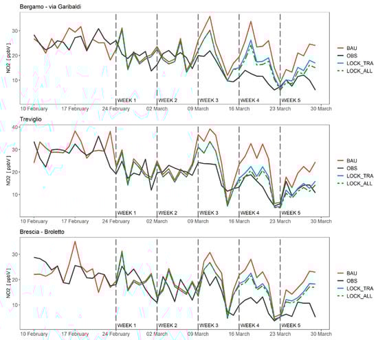 Moreover, comparing the NO2 hourly mean concentration simulated with CAMx (BAU, LOCK_TRA and LOCK_ALL) with air quality data from the ARPA Lombardia database [] allows for the following:
