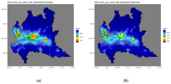 Absolute difference in NO2 concentration between LOCK_ALL and LOCK_TRA for week 4 (a) and week 5 (b).