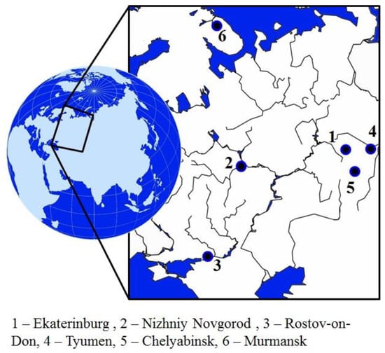 The study was conducted in six Russian cities located in different climatic and geographical zones (Table 1 and Figure 1). The southernmost city was Rostov-on-Don (47°14′ N); the northernmost was Murmansk (68°58′ N). The average January and July temperatures in the surveyed cities range from −15 to −3 and from 12.8 to 23.4 °C, respectively. Of the six cities surveyed, four have populations of more than 1 million people. The most populated is Ekaterinburg (about 1.5 million people), while 0.3 million people live in the least populated, Murmansk. All the cities are the administrative centers of their regions and play significant socio-economic roles. Ekaterinburg, Chelyabinsk, Nizhniy Novgorod, and Rostov-on-Don are major centers of industry, transport, and engineering. In Murmansk, the main economic focus is associated with the seaport (ship repair, fishing, fish processing); Tyumen is largely oriented towards oil refining. Three cities lie in the valleys of large rivers (Nizhniy Novgorod, Rostov-on-Don, and Tyumen), two cities (Ekaterinburg and Chelyabinsk) are located in the foothills of the Ural Mountains, and one city (Murmansk) occupies hills along a sea bay.