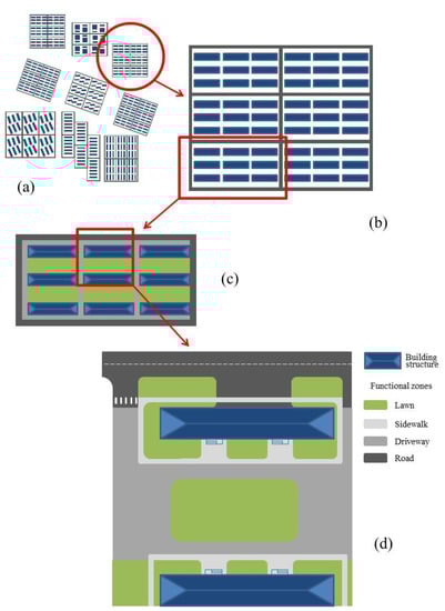 Typical structure of a residential area in a Russian city. (a) City’s residential area; (b) Microrayon; (c) Block of buildings; (d) EURL.