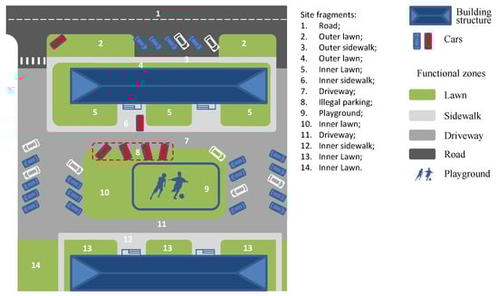 - Vehicle zone (driveways connecting courtyard spaces with the road network, parking spaces, and illegal parking places that are areas of other functional zones illegally used for parking).