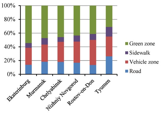 Division of the EURL area by functional zones is presented in Figure 4. An average of 18% of the residential area is related to the roads, from 13% in Rostov-on-Don to 26% in Tyumen. On average, the green zone occupies 53% of the area of the site excluding the road network. The smallest contribution of the green zone to the area was 42% in Tyumen; the largest was 63% in Ekaterinburg. The average area of the vehicle zone (Figure S1), including driveways, parking, and illegal parking places is 35%, from 29% in Ekaterinburg to 42% in Rostov-on-Don. On average, 59% of the area of a site belongs to the courtyard space.