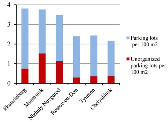 On average, 64 parking spaces determined by visual signs of parked vehicles were recorded at each site, of which 40 parking spaces were occupied by cars during the survey; 80% of the cars were parked in the courtyard. This constitutes 2.9 parking spaces, from 2.2 in Chelyabinsk to 3.8 in Ekaterinburg, per 100 m2 of the area of the courtyards, driveways, and parking spaces (the vehicle zone of the courtyards) (Figure 5). In the daytime, when the survey was carried out, there was an average of 1.1 parking spaces and 0.7 cars per 100 m2 of the courtyard area. The minimum number of cars was in Chelyabinsk (0.5), and the maximum in Tyumen (0.8).