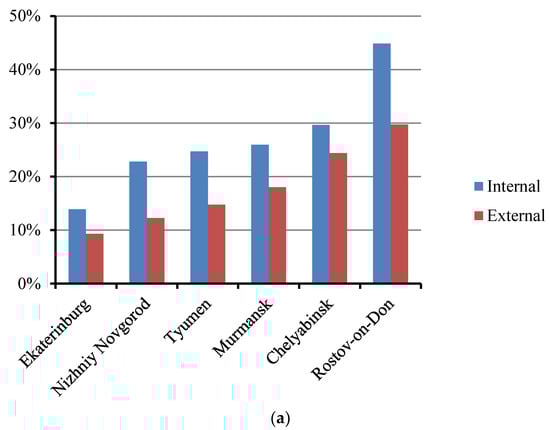 The average tree canopy cover was 26% of the total area excluding buildings and roads (Figure 7b). In Rostov-on-Don, the largest projective coverage of trees was observed—38%, and the smallest in Tyumen—21%. In all cities, the coverage of the external part of the EURL was higher than in the courtyard (Figure 7b).