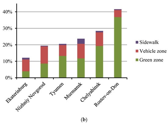 Of the approximately 2300 parking spaces, 487 (21%) are illegal parks on the lawns, sidewalks, and playgrounds (Figure S2). The number of illegal parking places varies significantly by city (Figure 5), from 11% in Tyumen to 36% in Murmansk. One car parked on the lawn disturbs soil in an area of approximately 27 m2. Illegal parking places occupy about 8% of the green area, sports and children’s playgrounds, and sidewalks; in Murmansk and Nizhniy Novgorod—about 14%; in Ekaterinburg, Chelyabinsk, and Tyumen—from 4 to 6%.