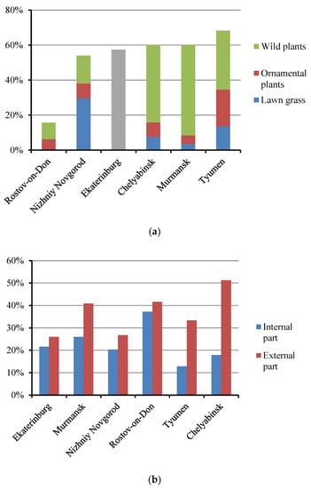 (a) Projective grass cover in lawns, taking into account the contributions of wild plants, lawn grass, and ornamental plants. In Ekaterinburg, the study was conducted according to another scheme. (b) Projective tree canopy cover of external and internal parts of the EURL.