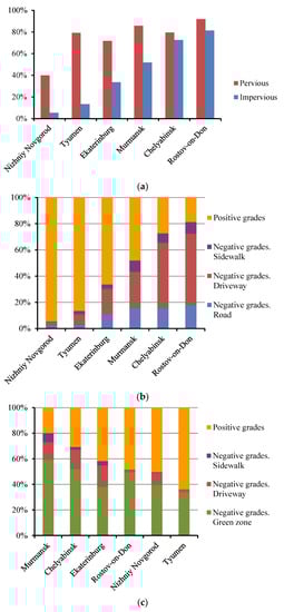 Assessment of the gradient in the surveyed sites showed that on average 56% of the urban landscape has a visible slope and visual signs of stormwater runoff. The smallest proportion of areas with a registered gradient within sites was observed in Nizhniy Novgorod (34%), the largest was in Murmansk (81%), and it was 53–59% in other cities. The presence of the gradient could be associated with the features of the natural landscape and the architectural solutions. In Murmansk, residential neighborhoods are integrated into the existing mountainous terrain of the Murmansk bay region. In Nizhniy Novgorod, the landscape of residential areas is mostly flat, though some of the residential areas are also located on a hilly shore.