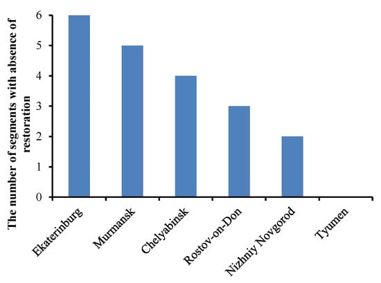 One of the most intense sources of surface contamination by sediment is earth and construction work. Under such activities, the destruction of surfaces, the storage of building materials, and piles of excavated soil without proper shelter occur. In some cases, proper restoration after completion of the earthwork was not undertaken in a timely way (delayed restoration, Figure S6). In total, various works affected 43 site segments (out of 484). Observed earthworks and construction included installing communications cables, sewage works, installing electricity cables, landscaping, road resurfacing, etc. Of all the cases of earthworks and construction documented at the sites, the storage of construction materials and waste on site occurred in 13 site segments (30%), and proper restoration was not carried out in 20 cases (47%). At 20 of the 36 sites, the consequences of such works associated with the formation and transfer of sediment were observed (55%). In total, earthworks and construction in residential areas affects about 9% of the territory. The largest number of segments with the delayed restoration was found in Ekaterinburg (Figure 9). In Tyumen, such sites were not identified at all.