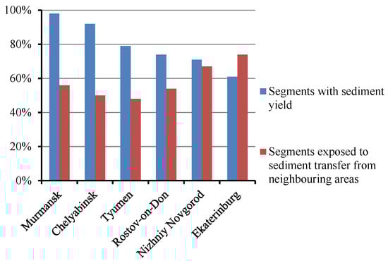 Sediment connectivity in the urban micro-landscape is characterized by the presence of sediment transfer between neighboring segments of the EURL. As can be seen in Figure 10, at least 48% of the segments were polluted with material transferred from adjacent areas. The maximum proportion of site segments with sediment supply due to transfer from neighboring areas was also found in Ekaterinburg (74%). In total, 430 of 484 site segments (80%) were subject to sediment formation or sediment transport that resulted in pollution of the urban environment with urban sediment.