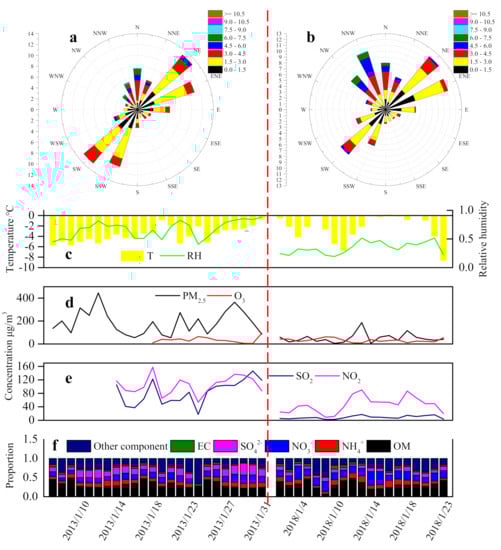 (a) Wind rose diagram for January 2013; (b) wind rose diagram for January 2018; (c) daily temperature (T) and relative humidity (RH); (d) daily concentrations of PM2.5 and O3; (e) daily concentrations of NO2 and SO2; (f) daily chemical composition of PM2.5.