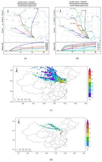 Backward trajectory and potential source analysis. (a) Backward trajectory analysis in January 2013; (b) backward trajectory analysis in January 2018; (c) potential source analysis in January 2013; (d) potential source analysis in January 2018.
