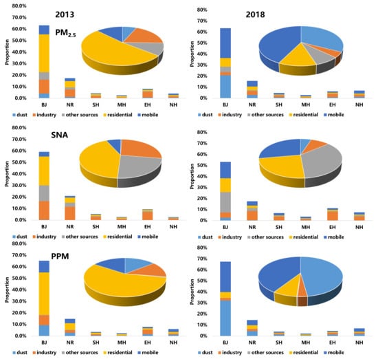 In order to guarantee a rapid and effective improvement in air quality for Beijing and its surrounding regions, strict control measurements have been implemented in the past decade. Thus, the contribution of various sources to atmospheric compound pollutants varied throughout the two study periods. Figure 3 shows the average contribution of the five major sources to PM2.5 and its major components, as well as O3. Local emissions contributed 63.3% and 63.5% to the total PM2.5 concentration during the two study periods. In the surrounding regions, they ranked in the order of NR > EH > SH > NH > MH in 2013 and NR > NH > EH > SH > MH in 2018. A larger contribution of NR was obtained in 2013 compared with that in 2018, while the contribution of the northern area (NH) in 2013 was much smaller. Since severe PM2.5 pollution was observed in January 2013, the poor air quality was closely related to the transport of air pollutants, especially from nearby cities located in the southern region. SNA was mainly converted from precursors including SO2, NOx, and NH3. The regional contribution was ranked in the order of NR > EH > SH > MH > NH in 2013 and NR > EH > NH > SH > MH in 2018. Primary particulate matter (PPM) was generally as a result of primary emissions. NR contributed most among the surrounding regions, followed by EH and NH in 2013, while NH and EH contributed most in 2018. It is worth noting that the regional emission contribution of SNA was larger than PPM during the two periods. This demonstrated that primary pollution was affected more by local and nearby emissions. However, SNA is more concentrated in fine particles and submicron particles, which are much more easily transported over longer distances.