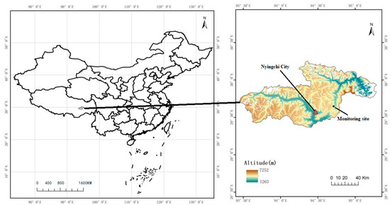 Location of the Nyingchi City and nitrogen deposition monitoring site.
