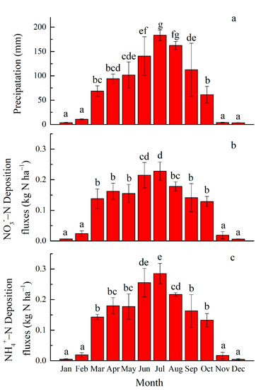 Precipitation varied throughout the year (Figure 2a), first increasing and then decreasing. It was highest in July (183.4 mm) and lowest in December (3.35 mm). No significant differences between amounts of precipitation in July and August were observed, based on the Duncan test. Precipitation in January, February, November and December were also similar. Variation in both NO3−-N and NH4+-N deposition in different months showed the same pattern as precipitation. Bulk Nr deposition mainly occurred from March to October, accounting for 96.2 percent of total annual NO3−-N deposition and 97.2 percent of annual NH4+-N deposition. Monthly bulk deposition of NO3−-N and NH4+-N ranged from 0.01–0.23 kg N ha−1 and 0.01–0.28 kg N ha−1, respectively (Figure 2b,c).