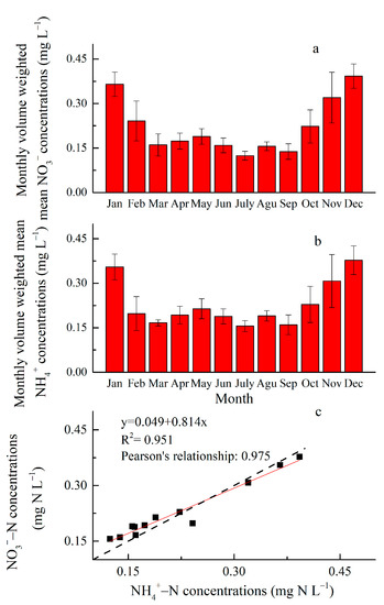 Monthly volume-weighted mean concentrations of both NO3− and NH4+ showed similar patterns of high in winter and low in summer, with little variation from March to September. Monthly concentrations of NO3− and NH4+ were in the range of 0.12–0.39 and 0.16–0.38 mg L−1, respectively (Figure 3a,b). In order to understand the predominant Nr deposition forms in different months, monthly concentrations of both NO3− and NH4+ were used in a linear fitting procedure. The result revealed that monthly NO3− and NH4+ concentrations in precipitation are positively significantly correlated (R2 = 0.951) (Figure 3c), and the dominant Nr form shifted from NH4+ to NO3− as the bulk Nr concentration increased.