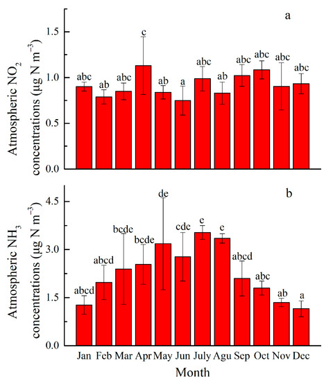 Monthly mean concentrations of atmospheric NO2 and NH3 were in the ranges of 0.79–1.13 and 1.15–3.53 mg N L−1, respectively (Figure 4). There was no obvious trend of monthly atmospheric NO2 concentrations throughout the year. In contrast, atmospheric NH3 concentrations increased from January to May and then decreased from August to December. The highest NH3 concentrations occurred from March to August, corresponding to the plant growing season.